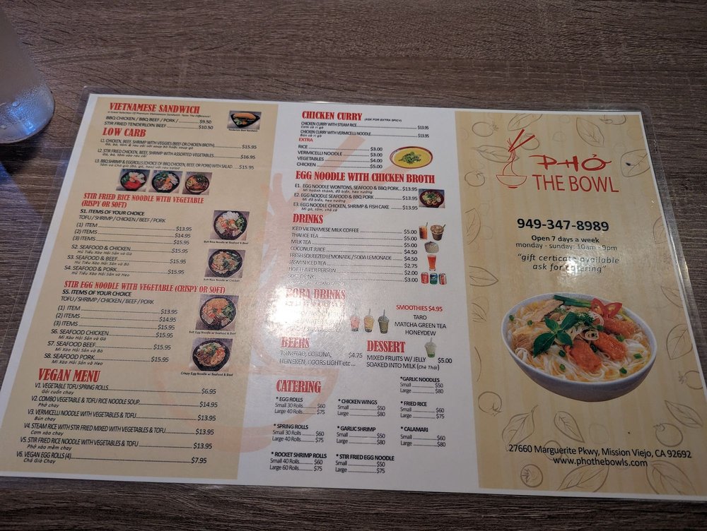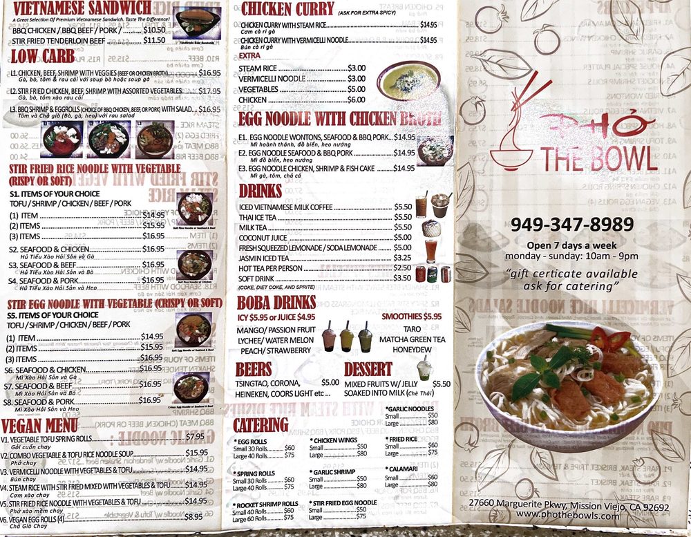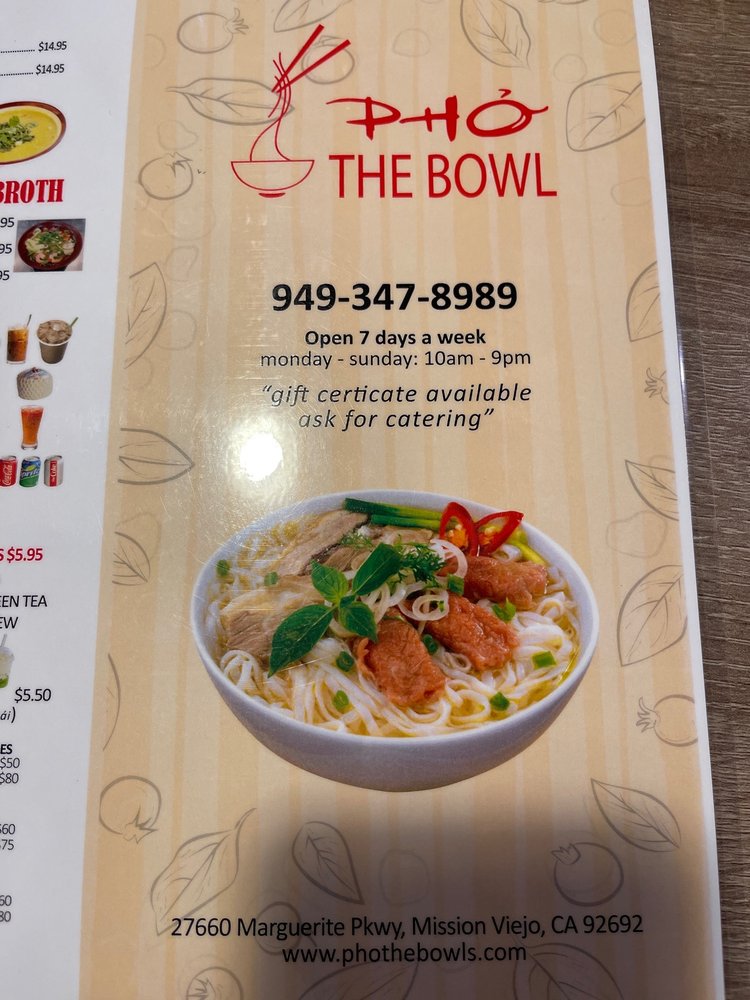 Pho The Bowl is a Vietnamese noodle restaurant located in Mission Viejo, CA, offering an array of appetizers like Fried Garlic Calamari Squid, Rocket Shrimp Rolls, and House Special Platter. Their signature vermicelli rice noodle salads come with various protein options like B.B.Q Chicken, B.B.Q Beef, and Tofu. Customers rave about the flavorful broth in their pho dishes, with generous portions of meat and traditional fixings like bean sprouts and basil leaves. The menu also includes refreshing bubble tea options and tasty salads. The restaurant provides a casual yet classy dining experience with friendly service and a spacious seating area. Visit Pho The Bowl for a satisfying Vietnamese meal that hits all the right notes.